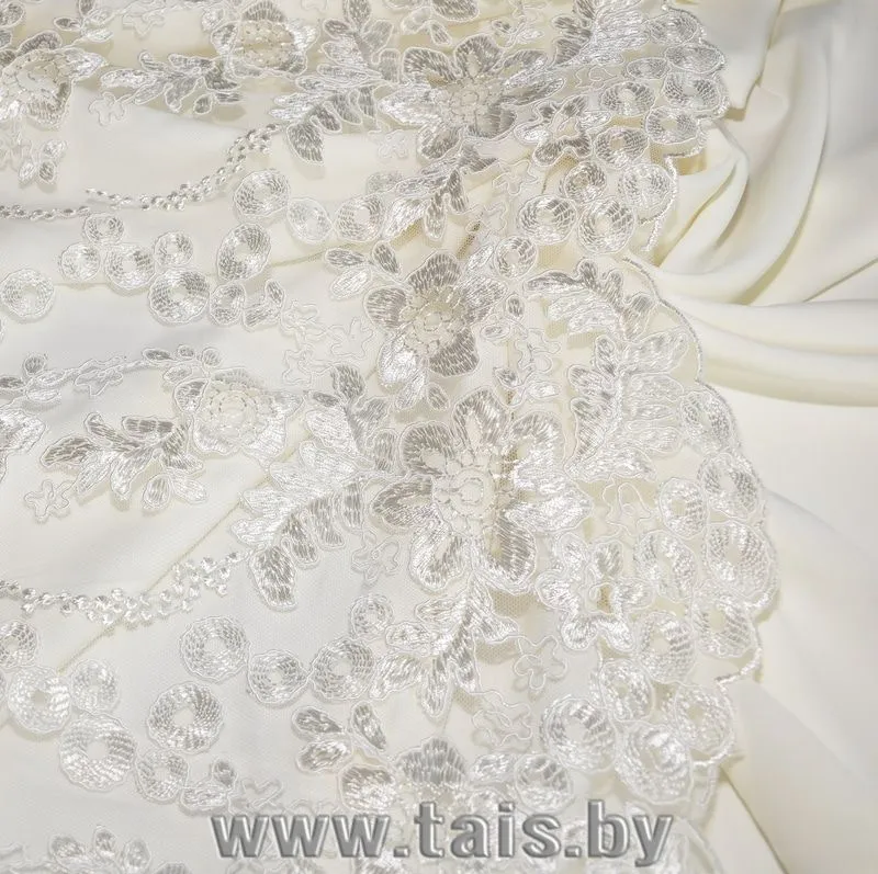Дорогие гипюры для свадебных и вечерних платьев уже сами по себе украшение, требующее лишь правильного и качественного исполнения. Купонная или сплошная вышивка, кружева, использование всевозможных напылений, бисера и много другого, в зависимости от фасона и веяний моды делают данные гипюры произведением искусства, а пошитые из них изделия эталонами красоты и элегантности.
