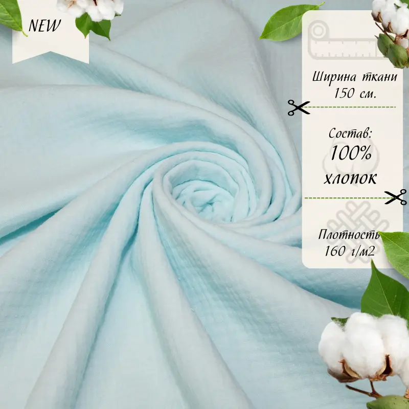 Муслин с двойной нитью  жатый — это очень нежный эко-хлопок для пошива воздушных летних платьев для взрослых и для детей, легких костюмов, мужских рубашек, стильных блуз, легких и мягких детских пеленок, комплектов постельного белья (покрывало, наволочки). Эта натуральная, полупрозрачная ткань идеальна для летней поры, она легкая и воздухопроницаемая.
