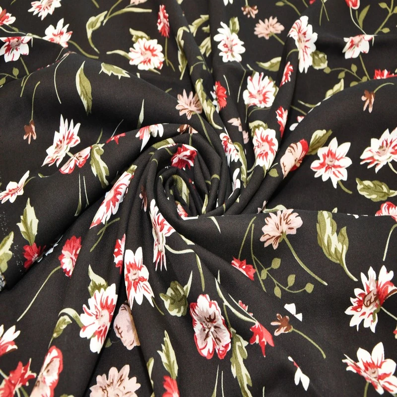Штапель принтованный — мягкая шелковистая непрозрачная натуральная ткань, изготовленная с добавлением вискозных волокон. Благодаря высокому содержанию вискозы, штапель обладает высокой устойчивостью к свету и микробным разрушениям, хорошими гигиеническими свойствами, повышенной теплопроводностью и приятной прохладой. Данная ткань хорошо драпируется, приятна и комфортна в носке. Набивной штапель применяется для пошива летних нарядов: сарафанов, платьев, юбок, блуз, топов и т.д.